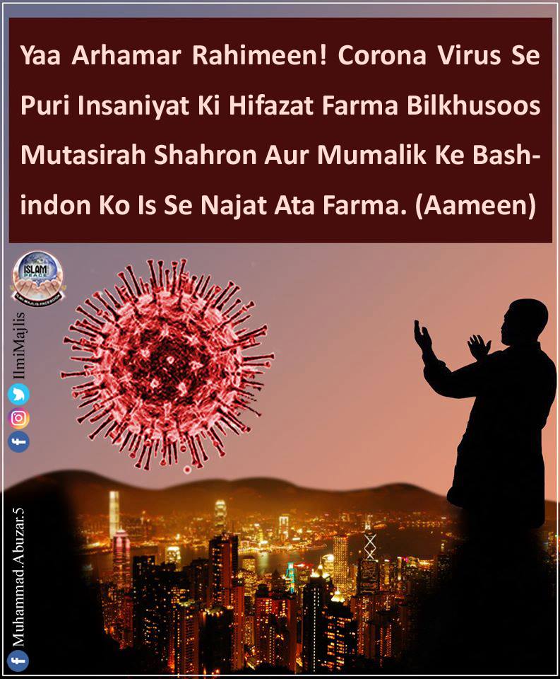 Yaa Arhamar Rahimeen! Corona Virus Se Puri Insaniyat Ki Hifazat Farma Bilkhusoos Mutasirah Shahron Aur Mumalik Ke Bashindon Ko Is Se Najat Ata Farma. (Aameen)